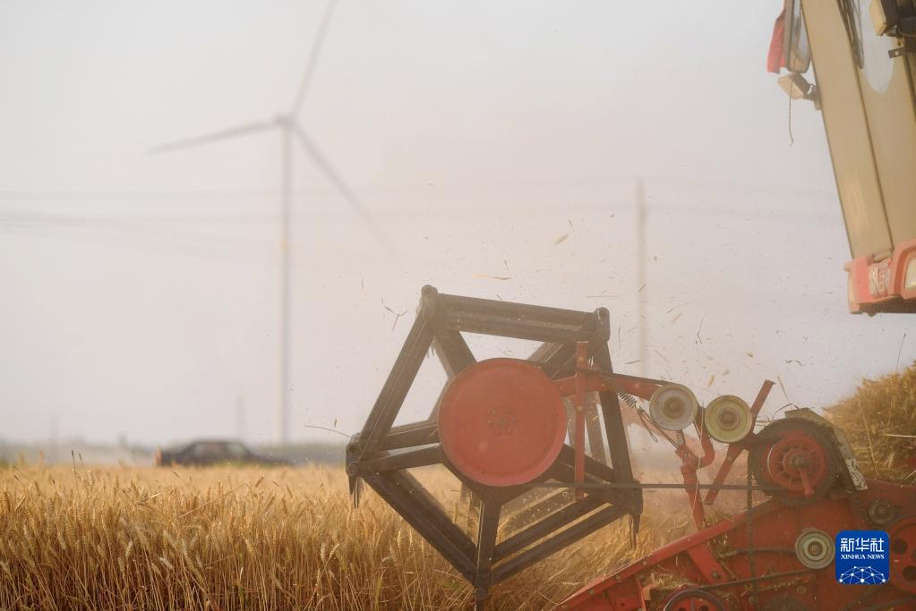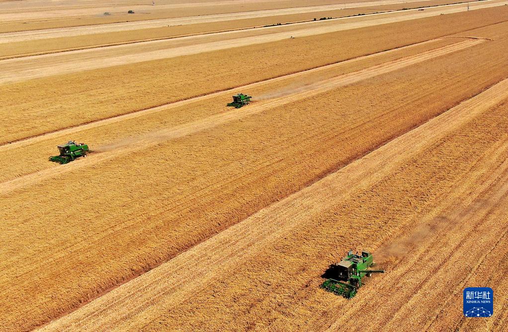 在河南省安阳市汤阴县菜园镇高标准农田示范区,收割机在麦田作业(2022年6月8日摄)。新华社记者 郝源 摄