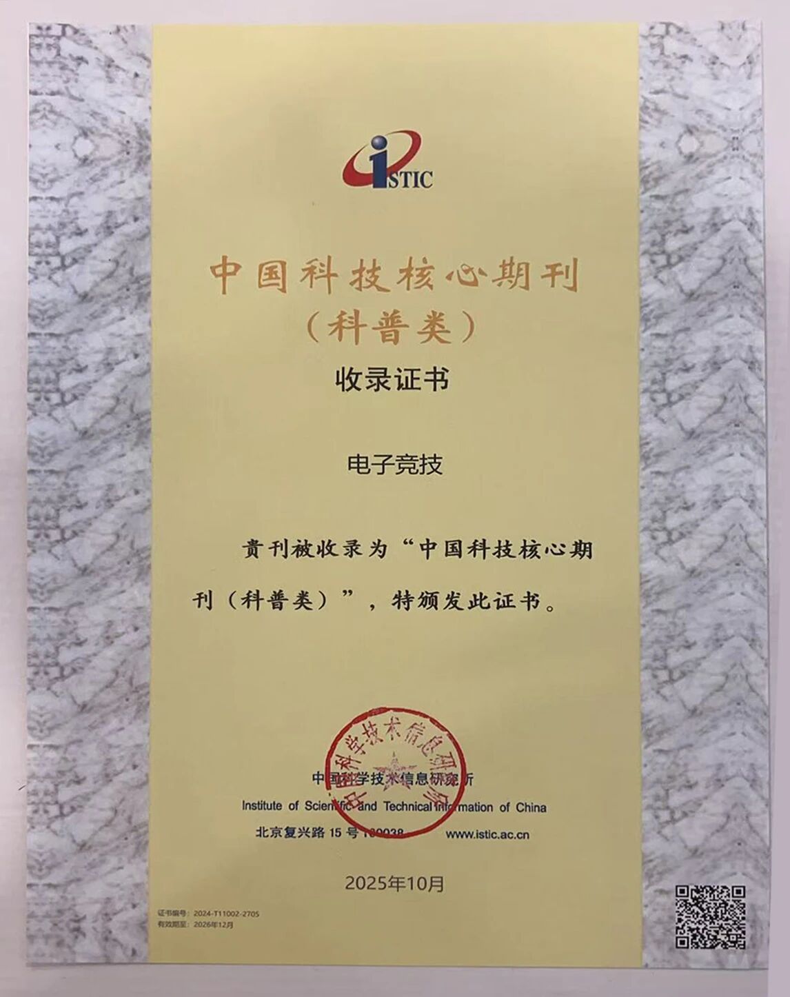 2025年10月30日,2025年“中国科技论文统计结果发布会”在北京国际会议中心举行。2025年度中国科技核心期刊评选结果在会上发布,《电子竞技》杂志入选。