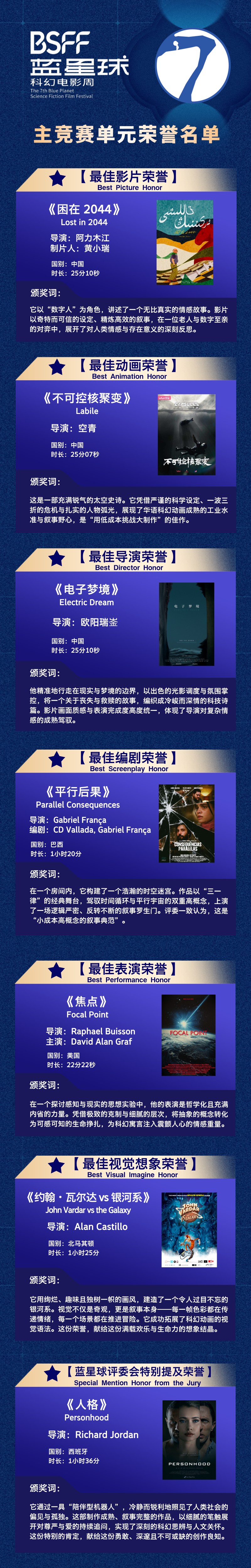 本届蓝星球科幻电影周终审评委团由知名监制、导演、编剧、科幻作家、科研工作者等组成,兼顾艺术、技术与叙事的多维评价视角。人工智能领域顶尖科学家、中国科学院自动化研究所研究员、终审评委之一曾毅代表组委会宣读了获奖名单(见下图)。中国科普作家协会副理事长、中国科学院古脊椎动物与古人类研究所研究员汪筱林等嘉宾为获奖者颁奖。
